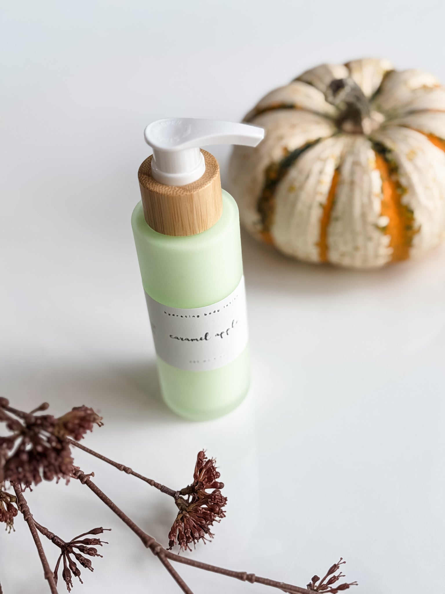 inspired by tart apples dipped in rich caramel, this lotion is made with essential oils of vanilla, bergamot, ho wood + nutmeg. enjoy this nostalgic, sweet scent that captures the magic of october nights + autumn harvests.