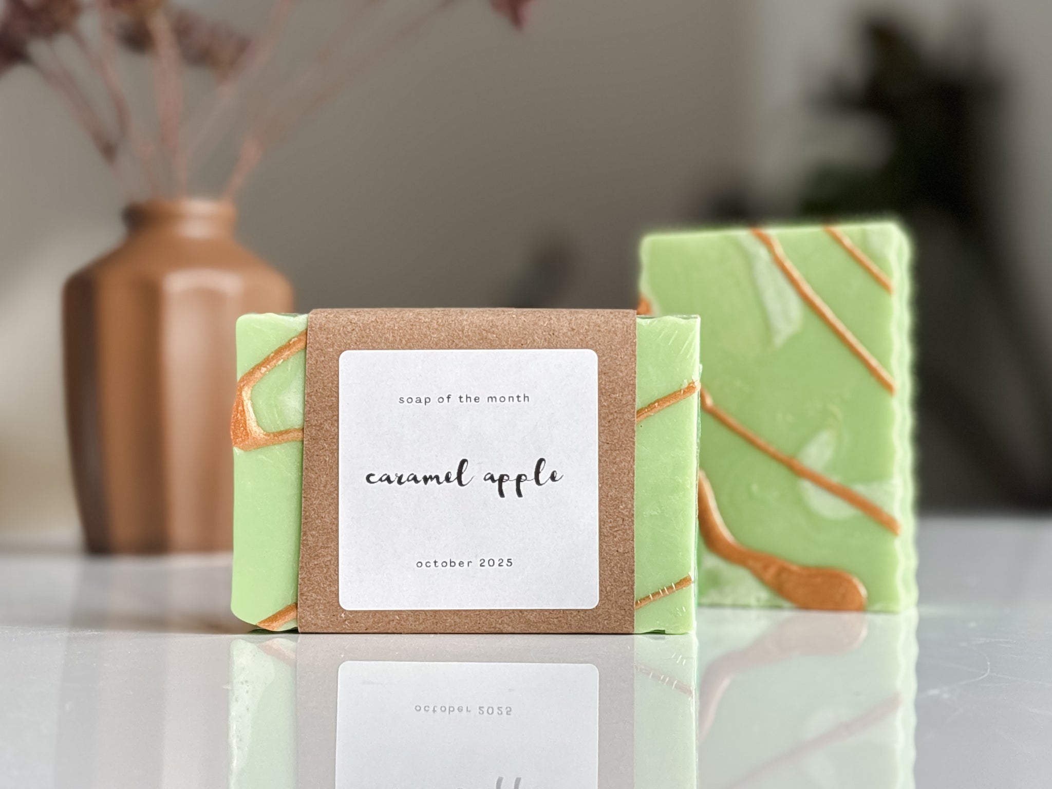 each month, we offer any leftover soaps from our soap of the month subscription boxes to the public. october's soap of the month is caramel apple!