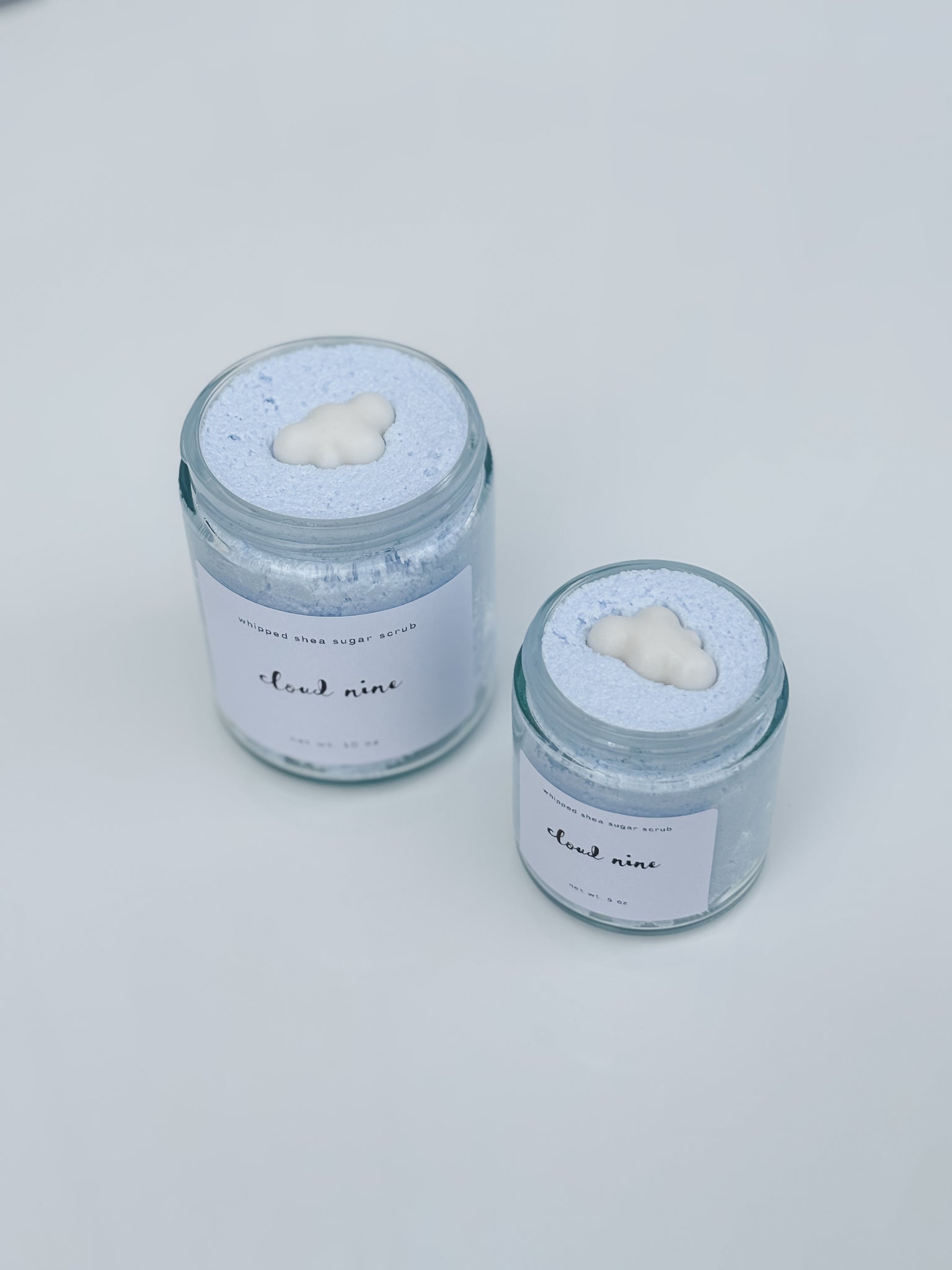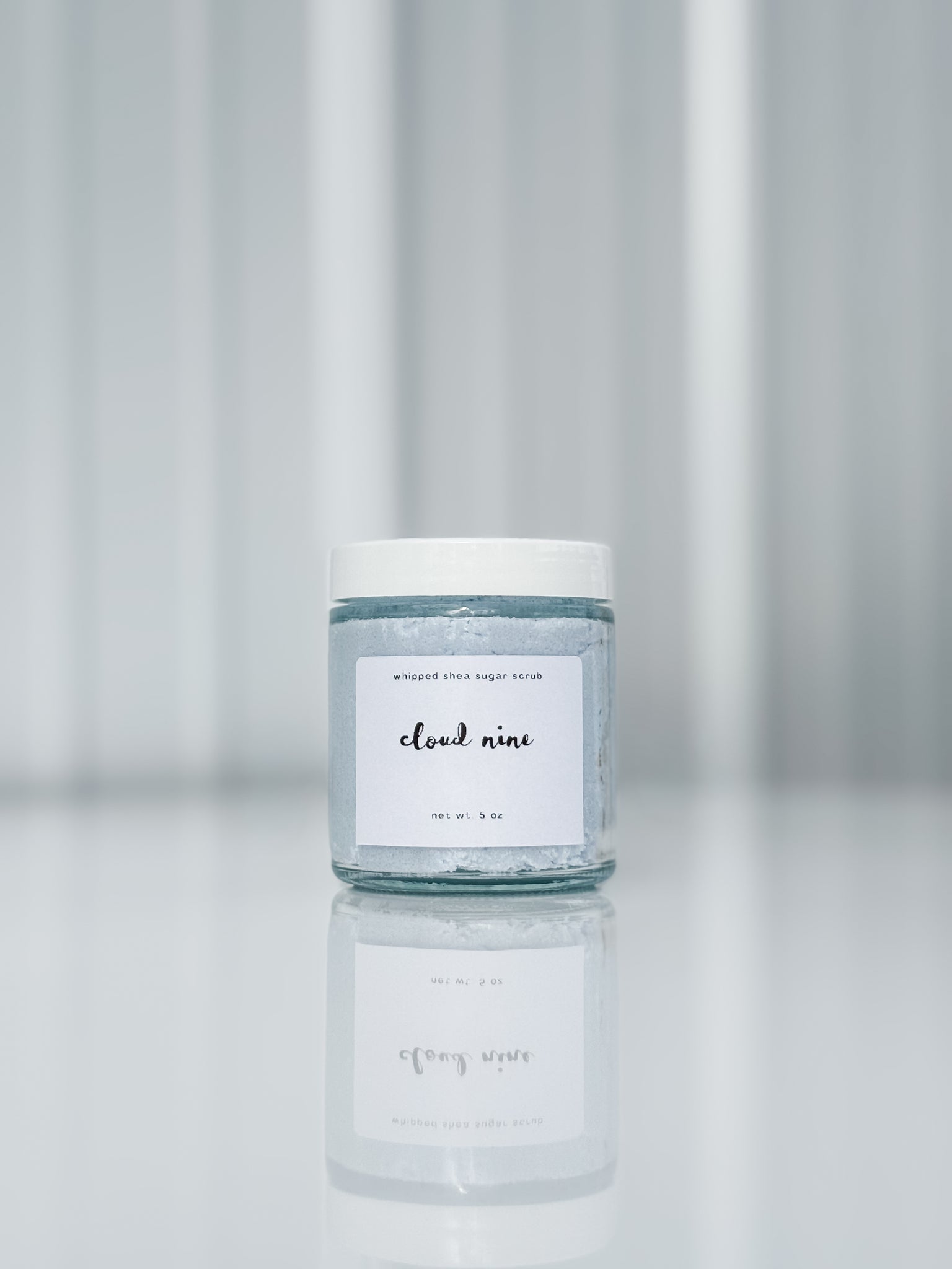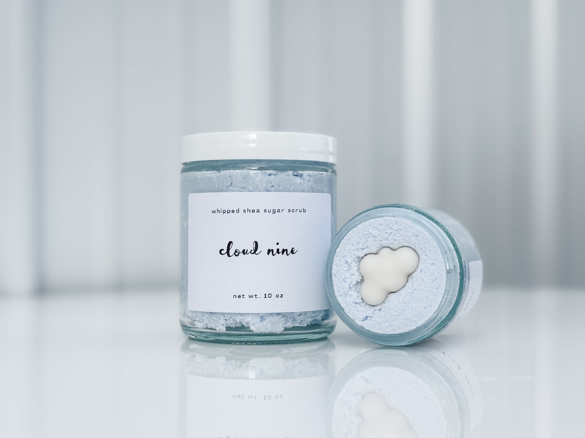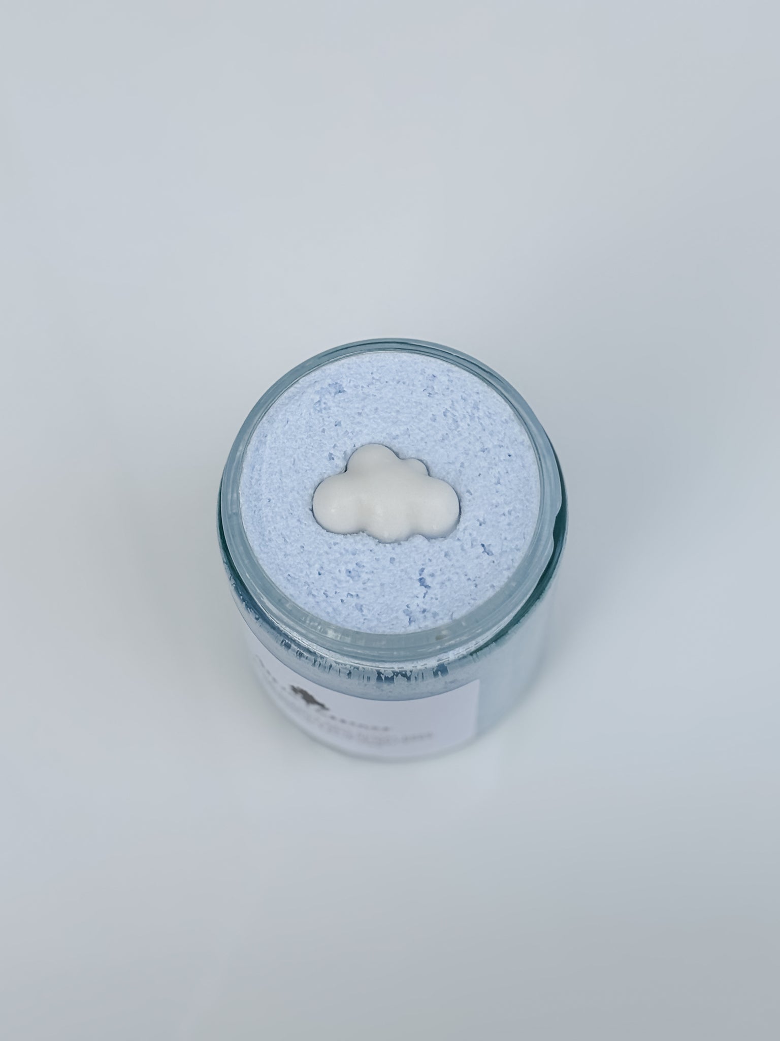 a fresh, airy blend of lavender + eucalyptus that feels like a deep breath in the clouds. this whipped shea sugar scrub gently exfoliates while nourishing the skin, leaving it soft, smooth, and refreshed. finished with a single-use soap embed for a playful, practical touch.