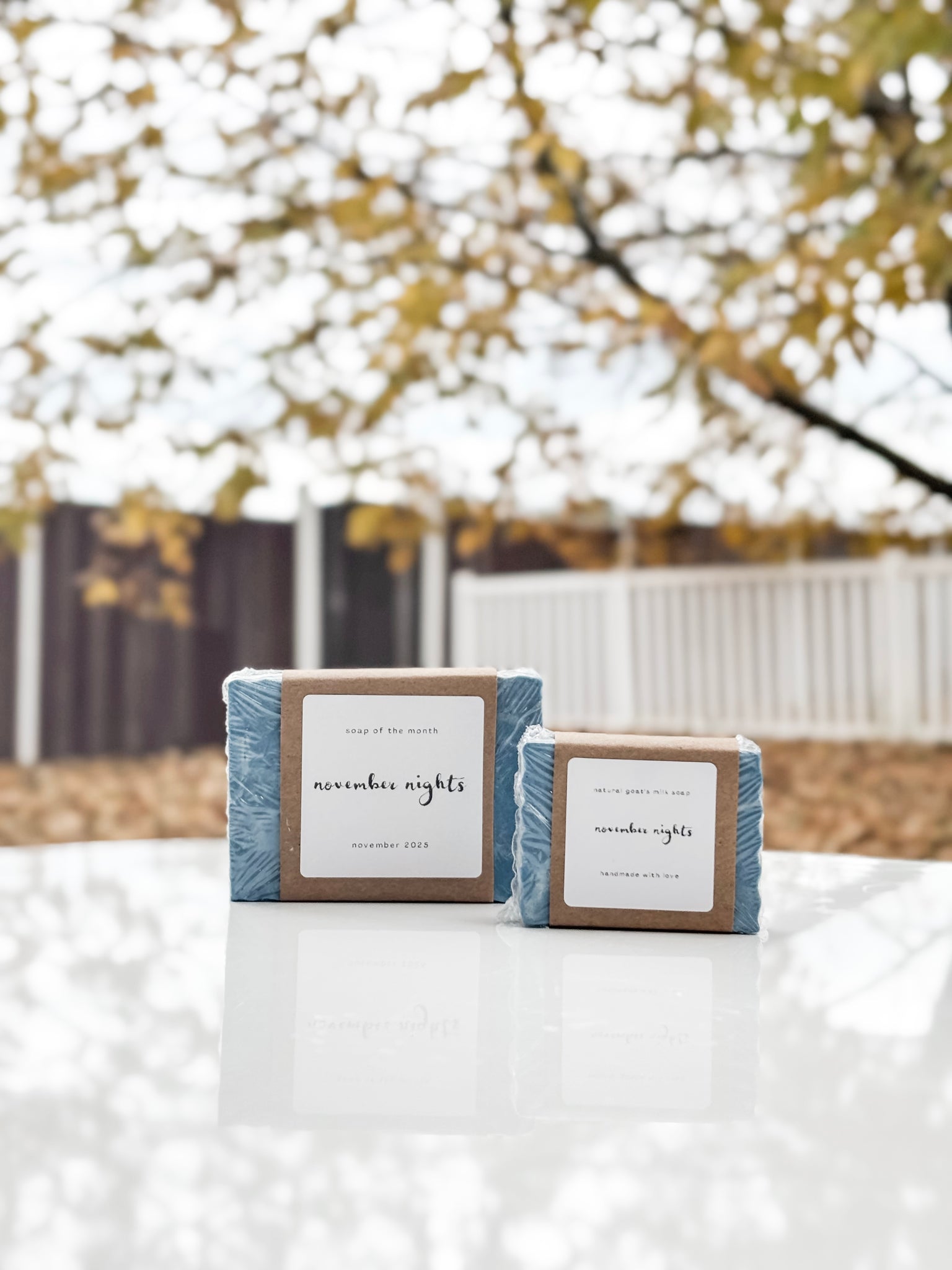 each month, we offer any leftover soaps from our soap of the month subscription boxes to the public. november's soap of the month is november nights!