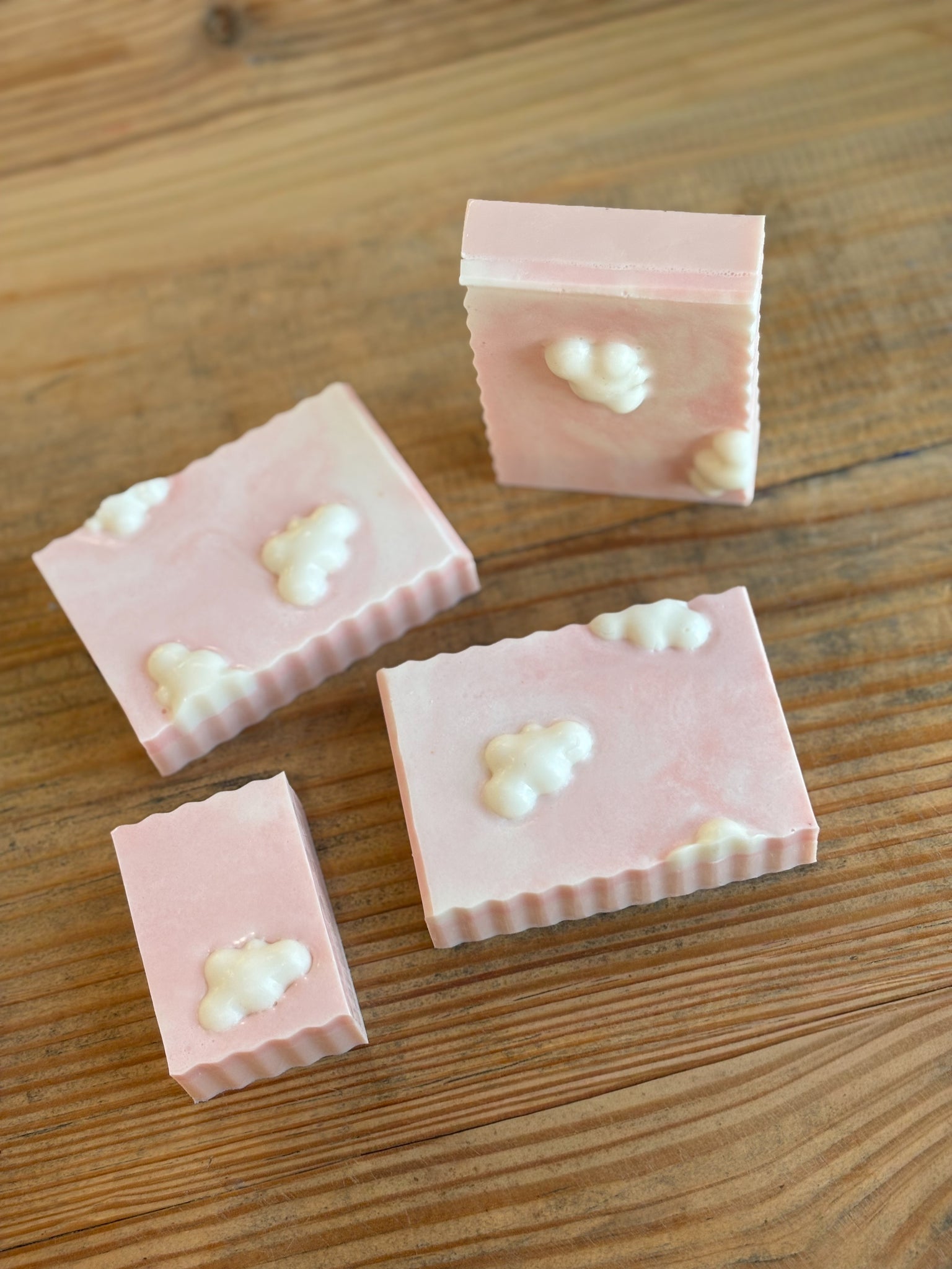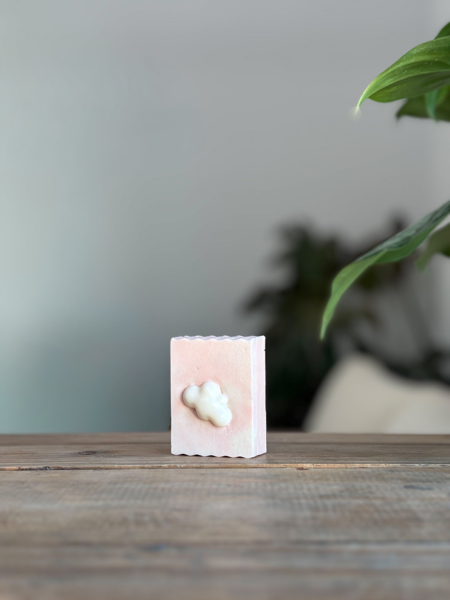 a cozy, comforting blend of jasmine + vanilla made for winding down. this gentle bar creates a rich, creamy lather with a soft floral sweetness that turns everyday washing into a peaceful, end-of-day ritual. adorable cloud embeds adorn each bar!