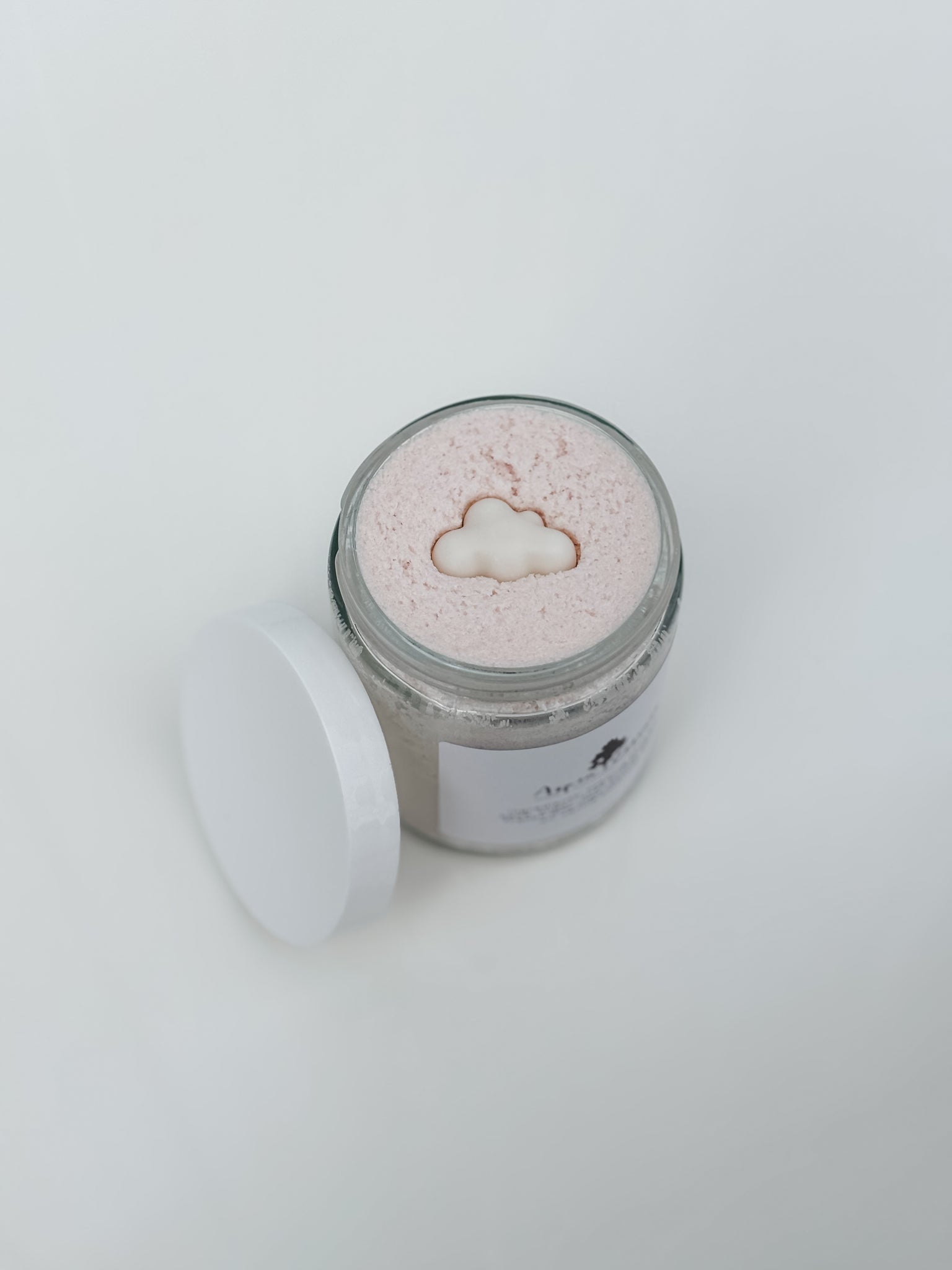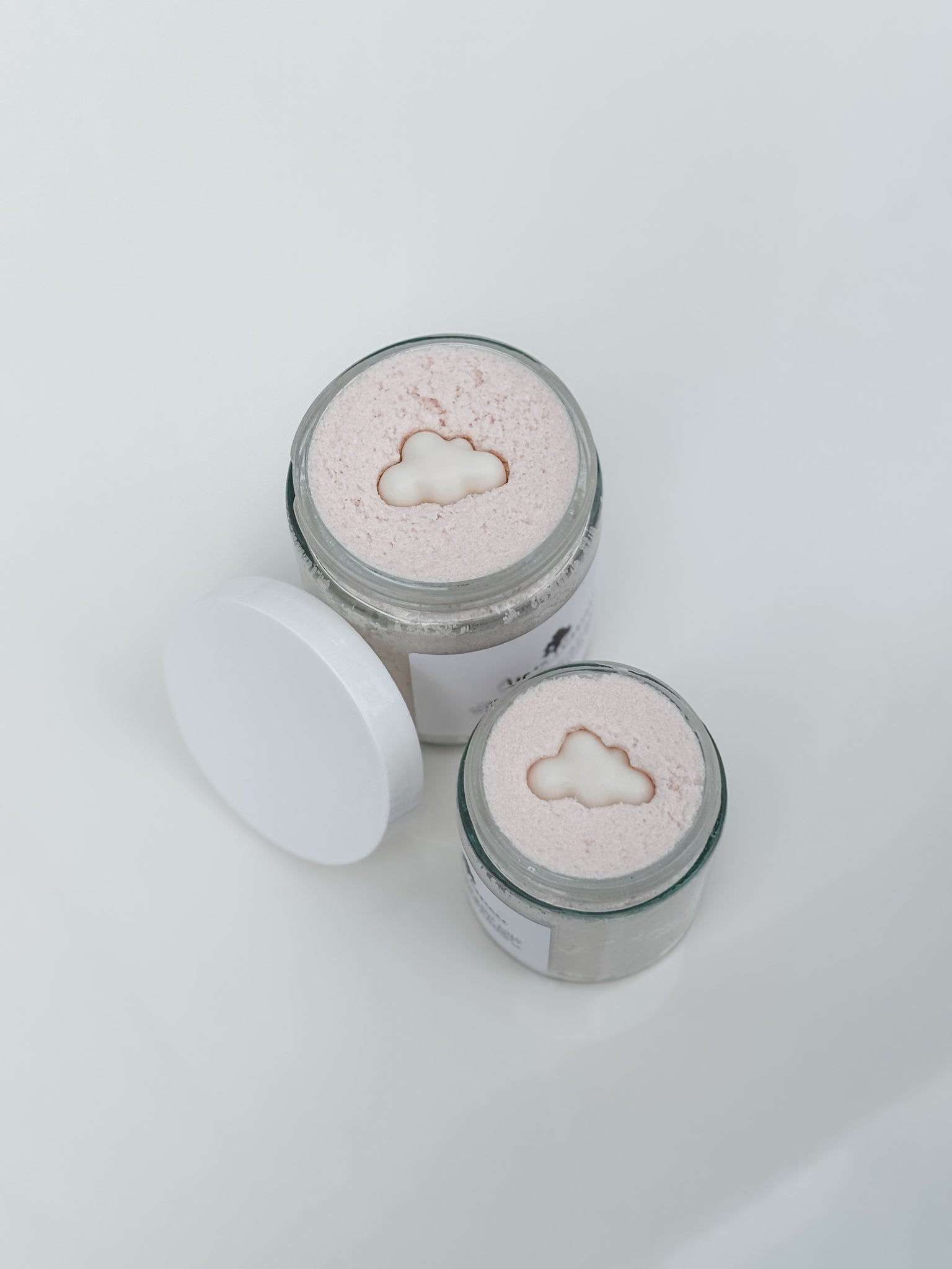full ingredients: foaming bath butter base, sugar, shea butter, coconut oil, jojoba oil, vanilla essential oil, jasmine essential oil, french pink clay.
